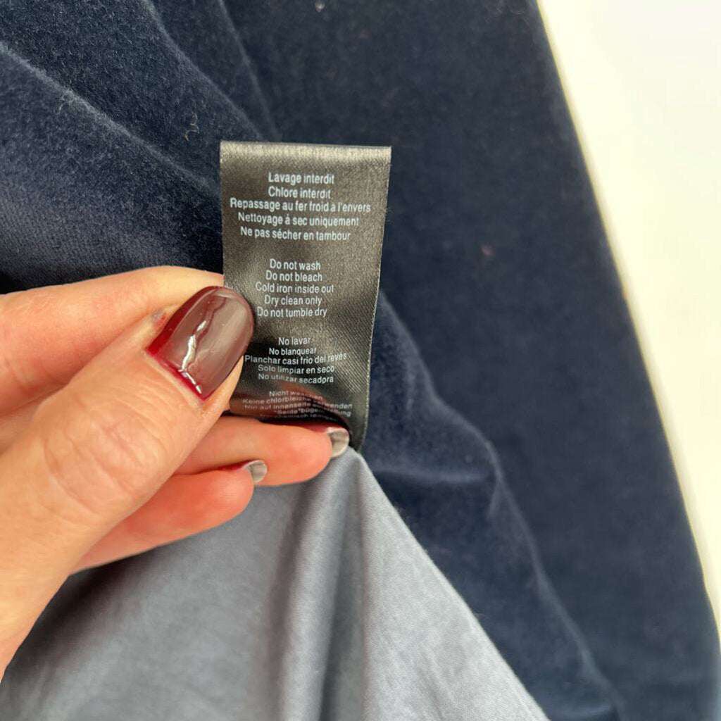 Good used condition, pocket is still sewn shut, but there is a small flattening on the left collar and crushed velvet that is under the lapel - the last two photos show where it is flattened in relation to the lapel - the pen hasn’t been moved. The tag size is large but if you look at their size chart a large has a waist size that would normally be a US small. Shoulder 15", Sleeve 25", Bust 37", Total Length 25".