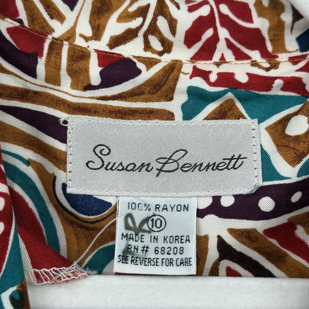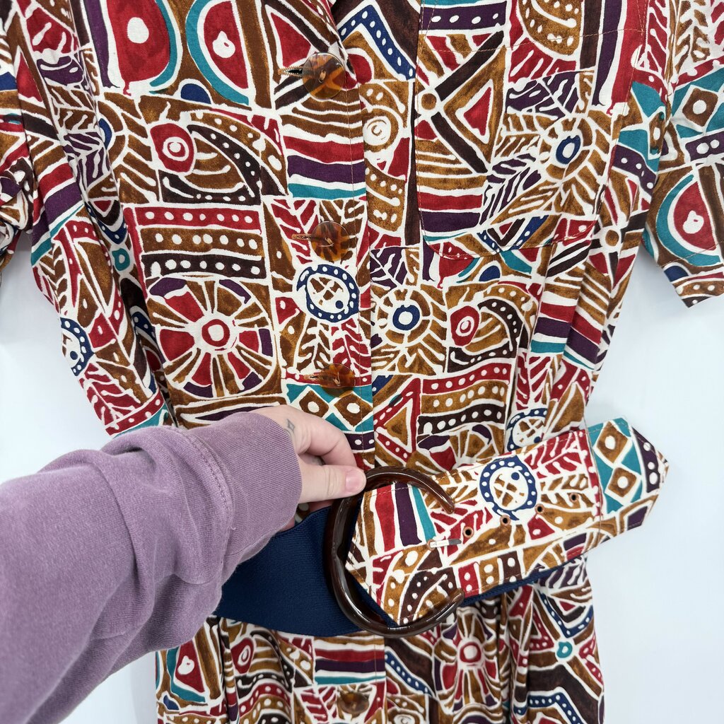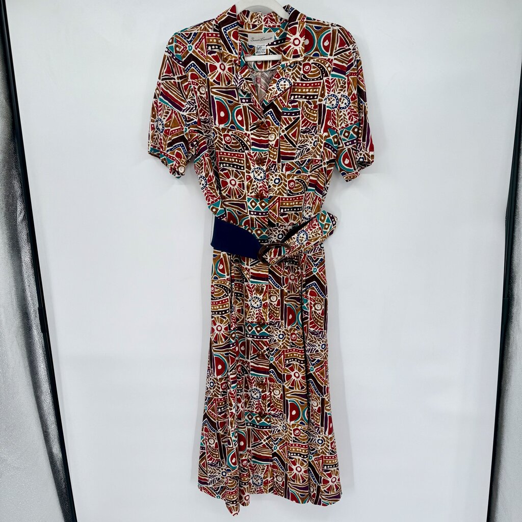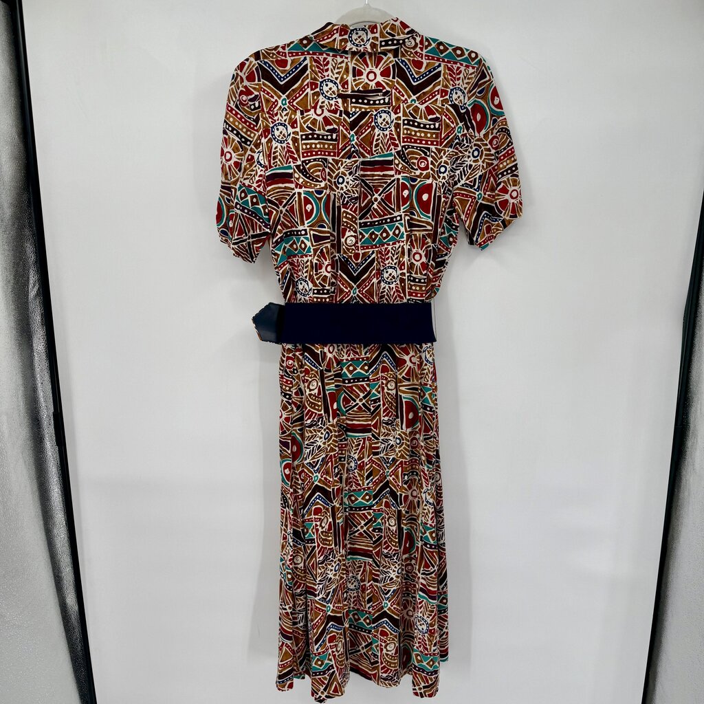 women Susan Bennett Vintage Geometric Belted Midi Brown Red Multi Dress 10