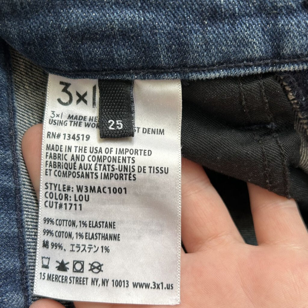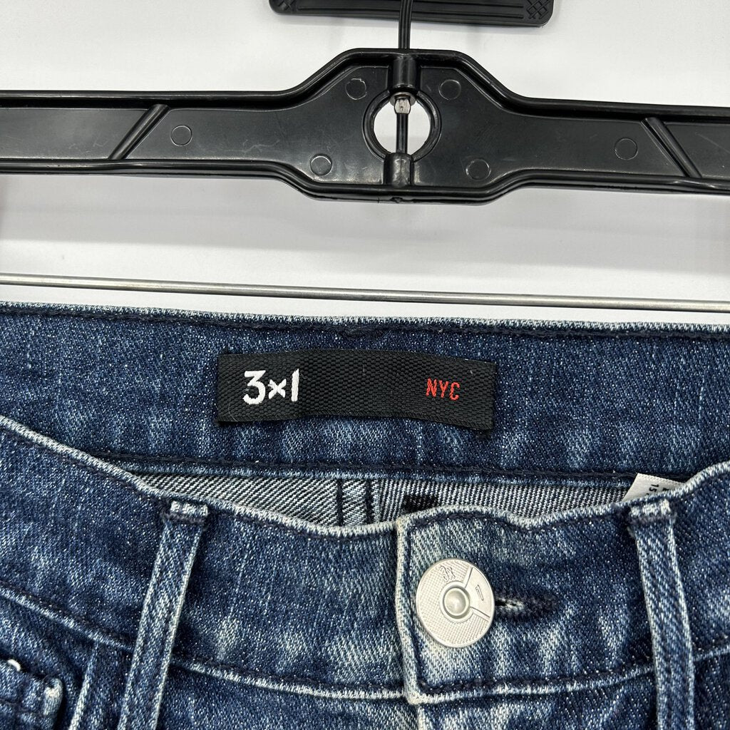 3x1 Slim Straight High Rise Raw Hem Blue Jeans Women's Size 25/0. High rise. Raw hem. Very good used condition, light discoloration on back of right leg, see photos. Measurements in inches: Waist 26, Hip 32, Rise 10, Inseam 27