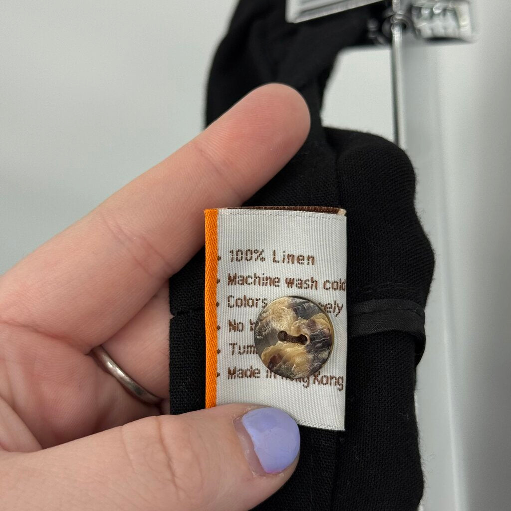 Ankle length. Ripple Button Detail on the Front. Back flap pockets. Full Leg. Adjustable tie hem. Elastic waist on sides only. 100% Linen; wrinkle resistant, lightweight, comfortable, and always smooth. Machine wash cold with like colors, tumble dry low, hang straight.  Pre-washed, pre-shrunk. Excellent used condition. Waist 28", Rise 12", Inseam 28"