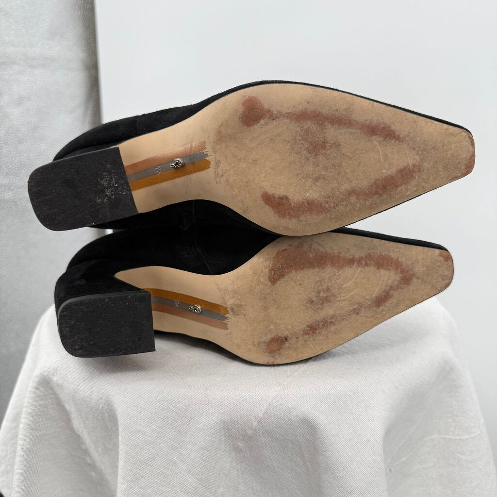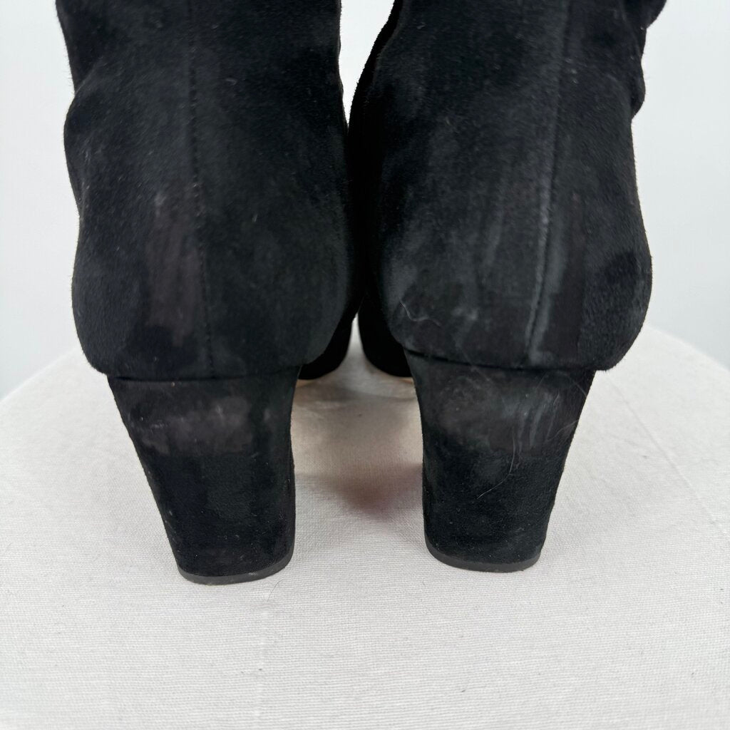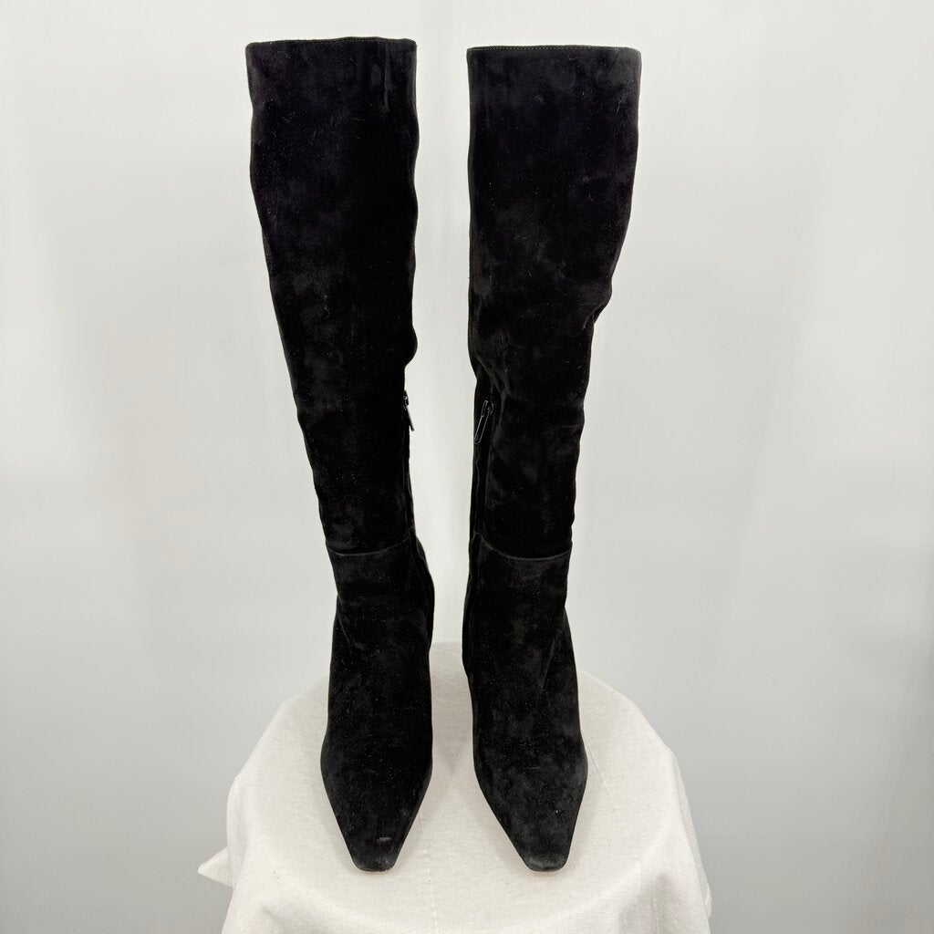 Very good used condition, light marks on suede, see photos. With a piercing pointed toe and a curved heel, our sensationally suede boots are the sleekest heels you'll never want to take off. Pair with a little black dress and an updo to feel like a princess. Closure: Zipper Toe: Pointed Heel. Height: 2.75" Boot Shaft: 16.7" Calf Circumference: 10" Material: Leather. Insole: Synthetic.