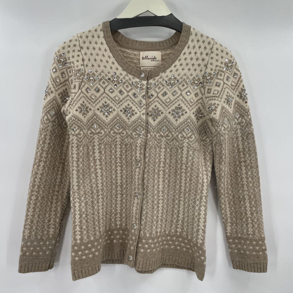 women Telluride Clothing Co. Lambswool Fair Isle Beaded Cardigan Taupe and Cream Sweater S