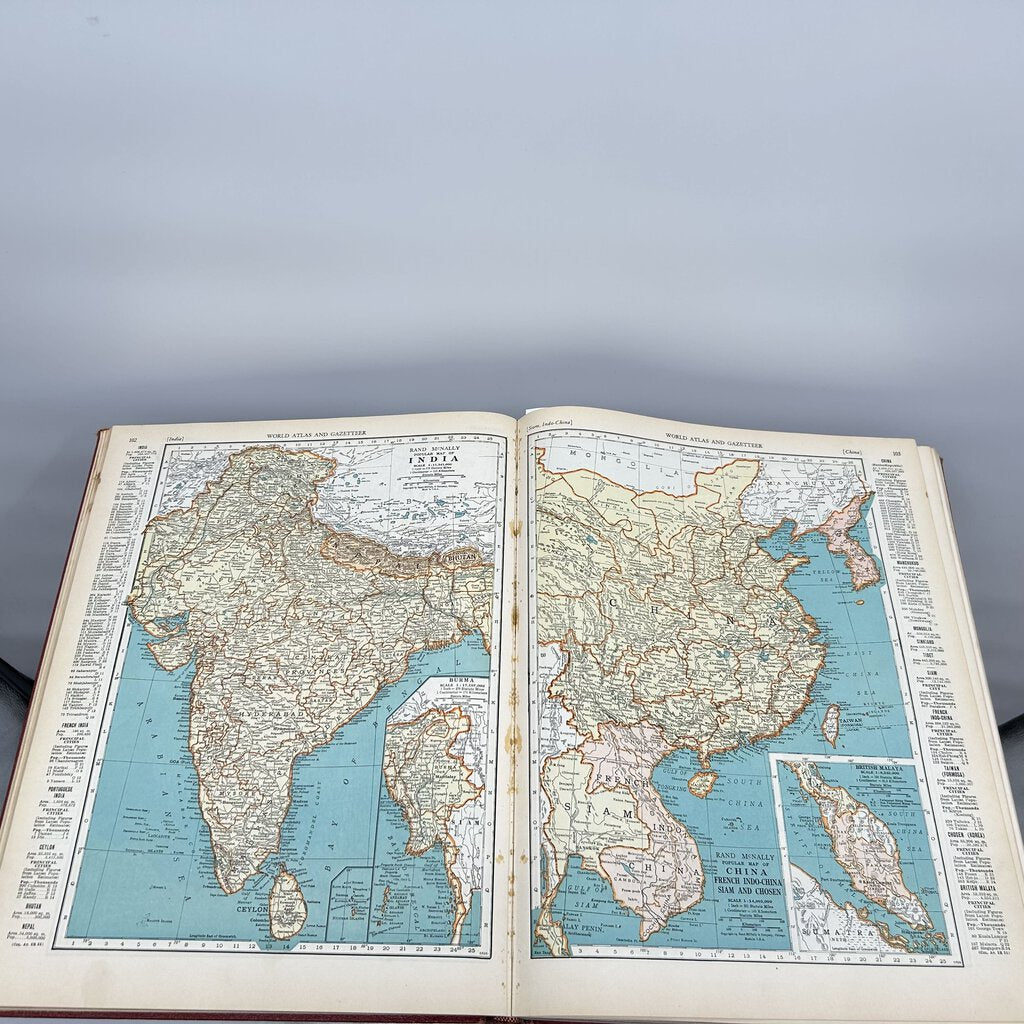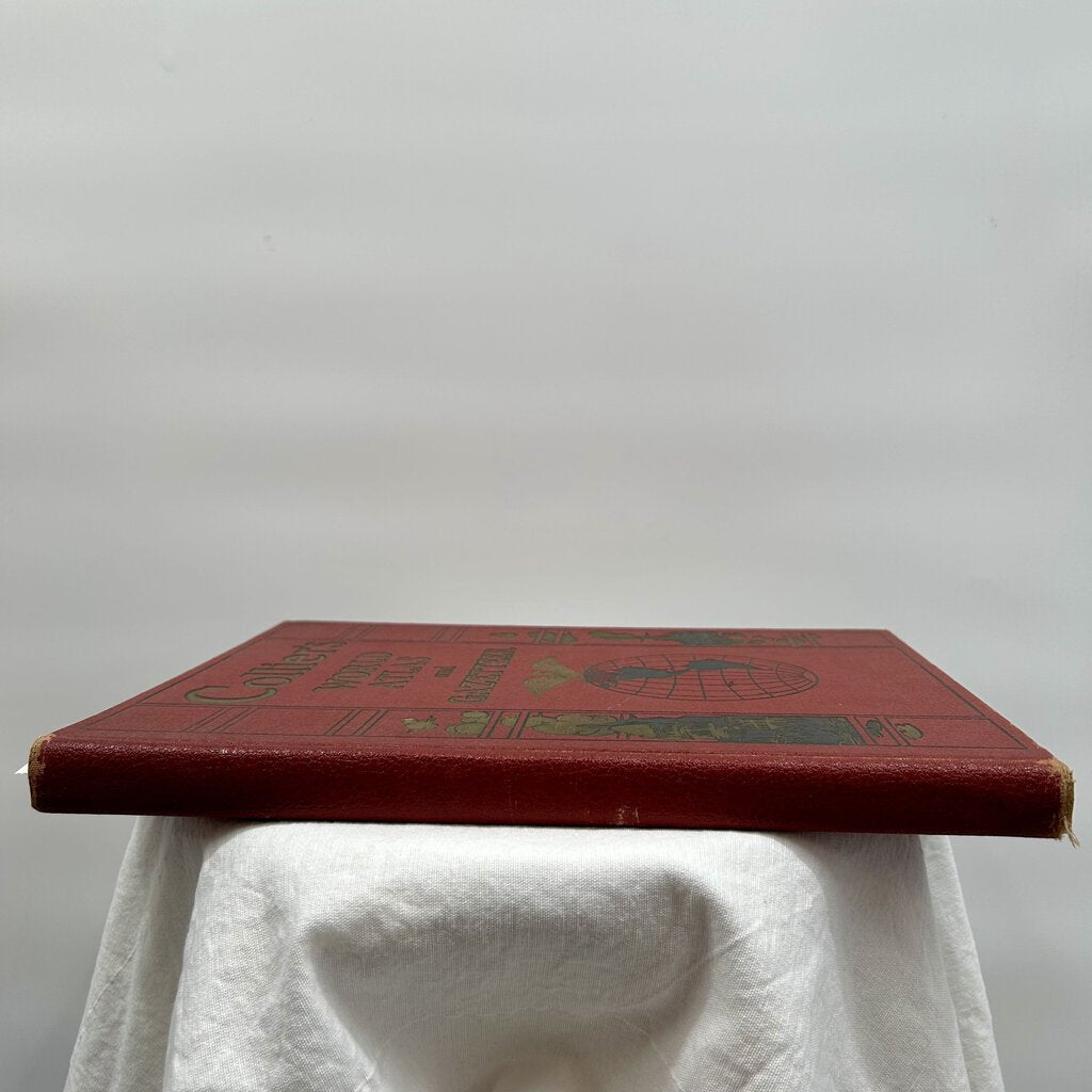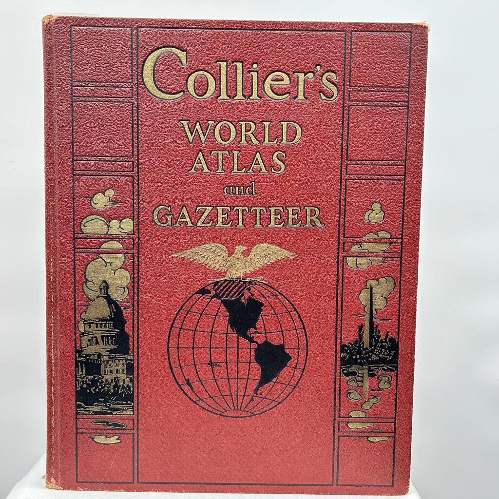 Collier's World Atlas and Gazetter 1935 Edition. Published in New York by P.F. Collier & Son Corporation. Foilo in maroon stamped and gilted boards; 328 pages: illustrations, maps (some color); 37 x 29 cm; indexes. Copyrighted in 1935. Very good vintage condition. Leaves are lightly foxed, but overall clean. Binding is fairly tight. Corners of book have some wear. Some excess foxing on exterior of leaves.