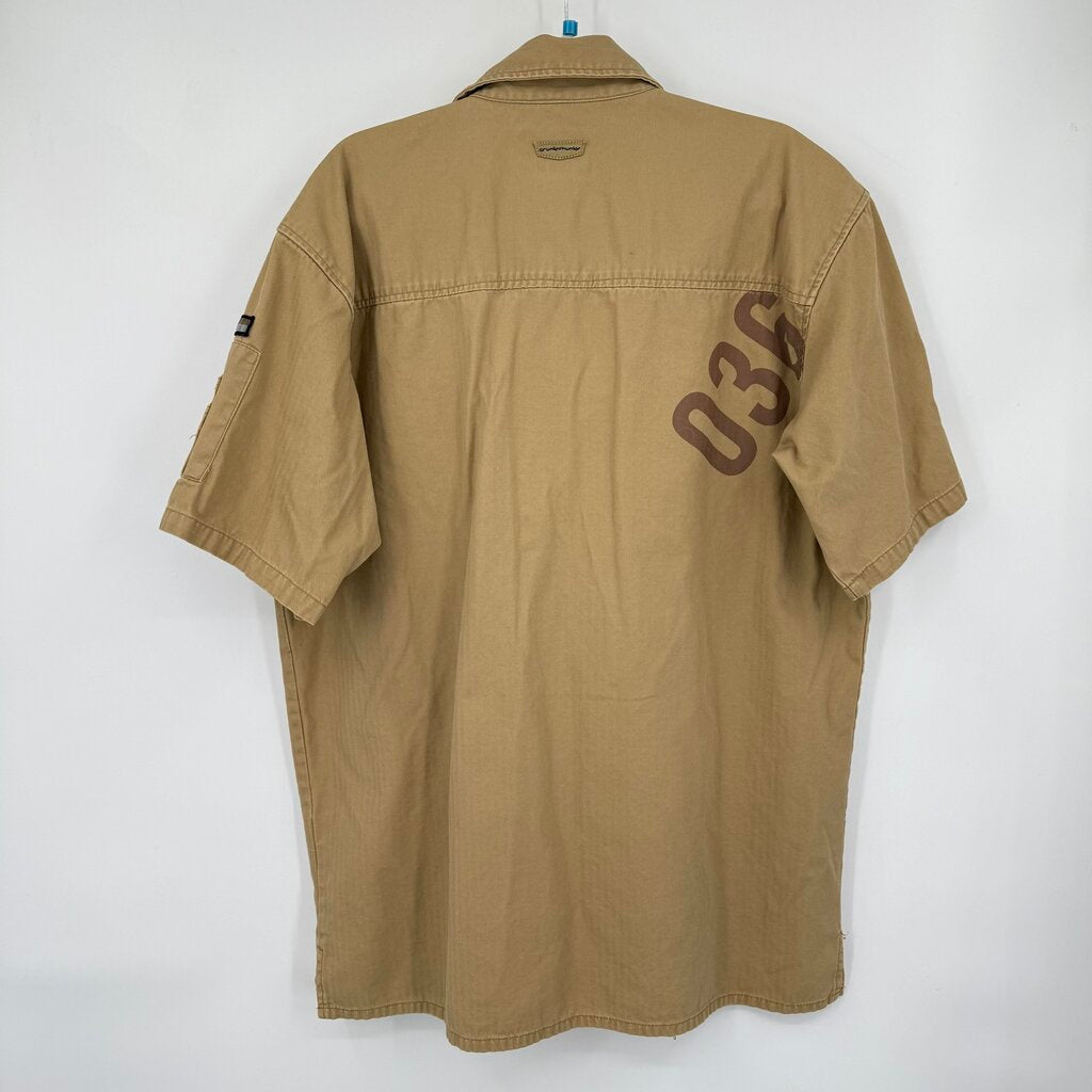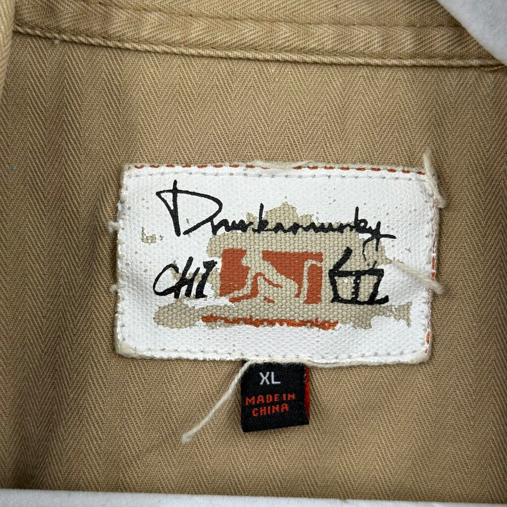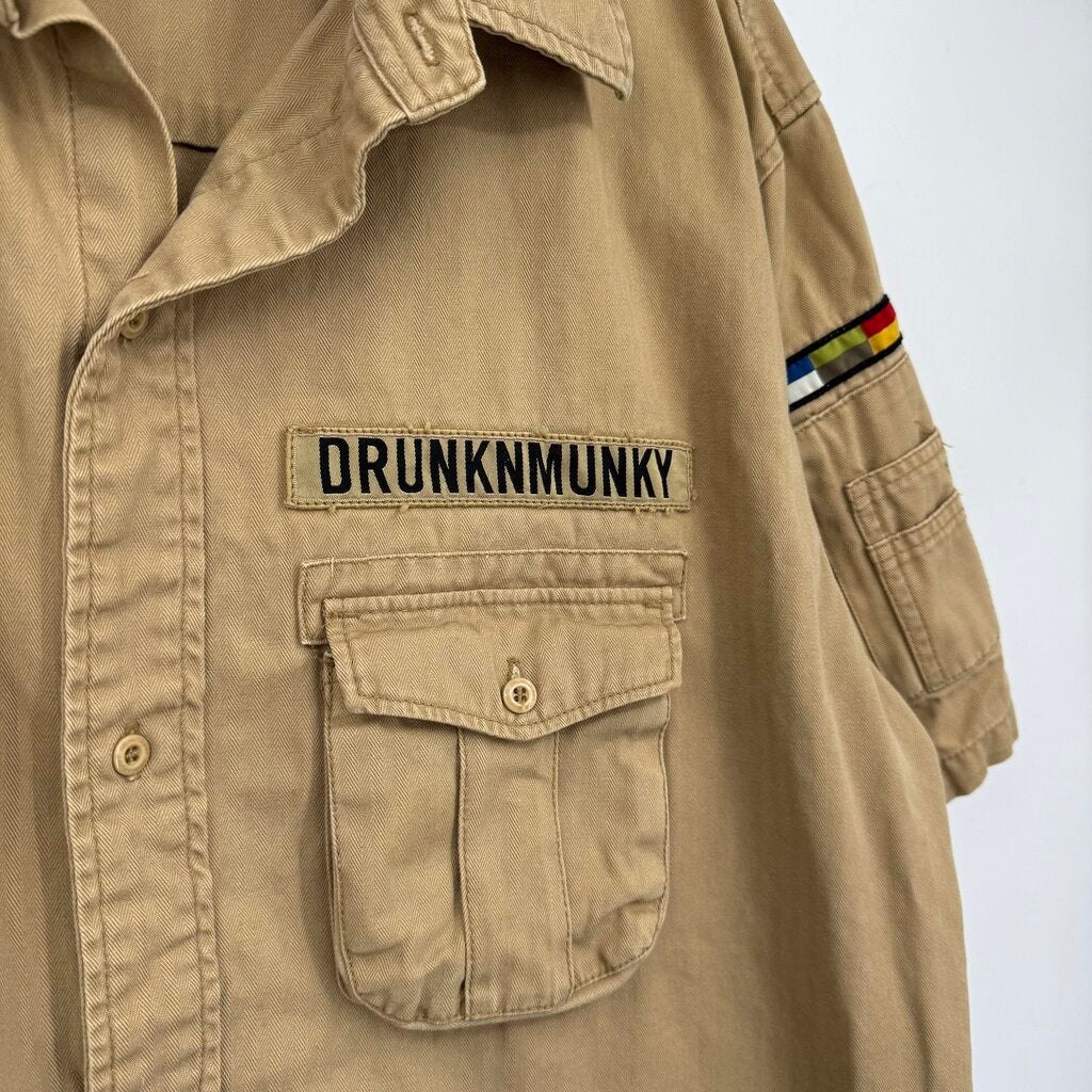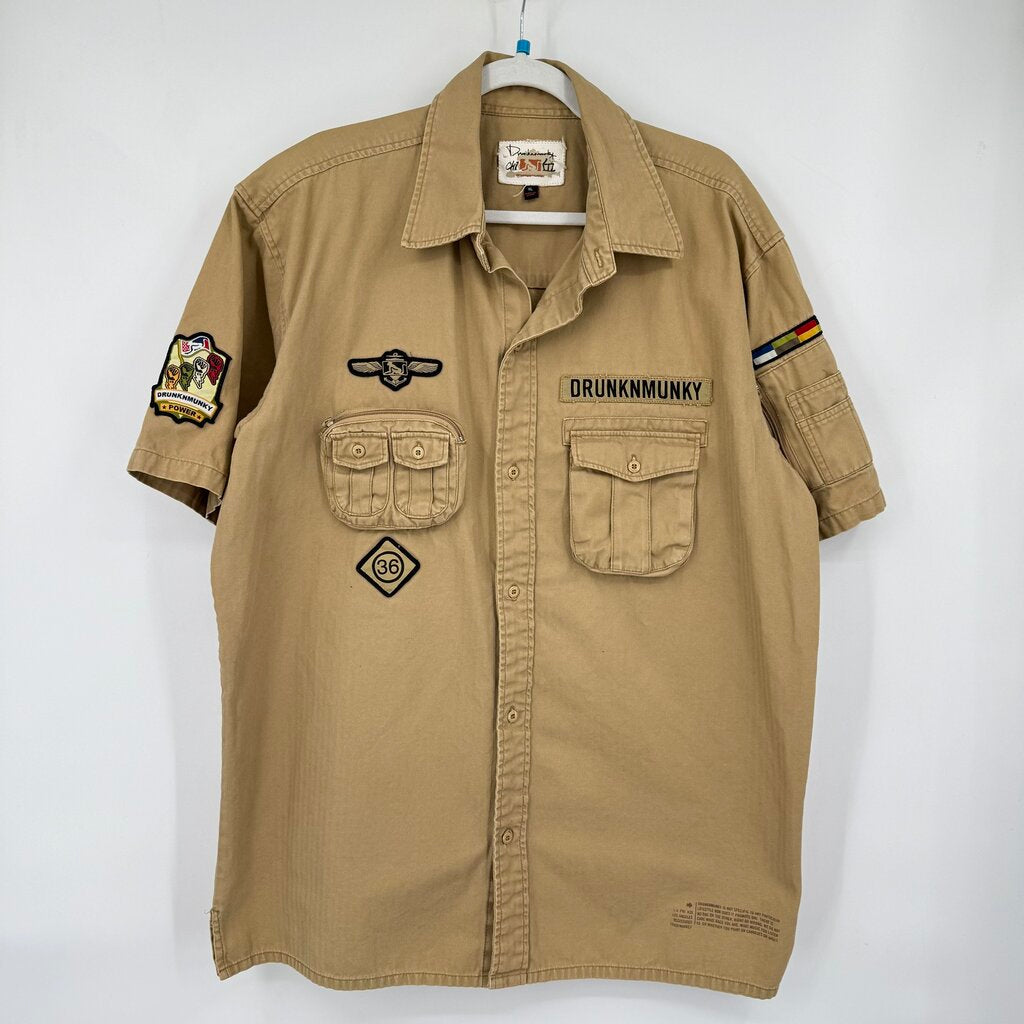 men Drunknmunky Patch and Pocket Button Front Khaki Multi Woven Top XL
