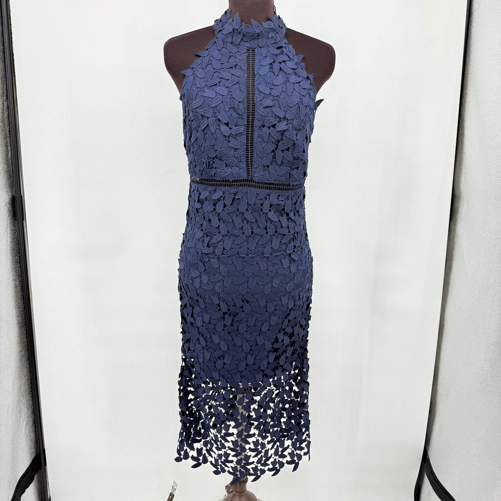 Rock your next evening event with the Bardot Gemma Halter Dress, featuring a delicate embroidered outer, reminiscent of floral petals. The alluring halter neckline has cutaway panels, an open back, and a luxe satin lining. Our model is wearing a size 8 dress. She is 5’11” (181cm) tall and has a 24.5 inch waist. -Slim, tailored fit - Embroidered lace outer; satin lining - Navy hue - Halter-neck design - Sheer, cutaway sections - Boning at sides for support - Extended sheer lace panel - Open back - Invisible zip back closure - Mid length. 34" bust, 30" waist, 37" hip.