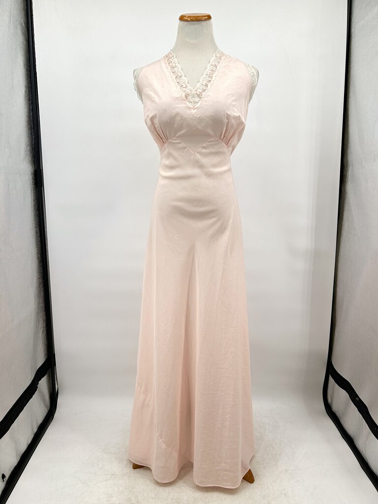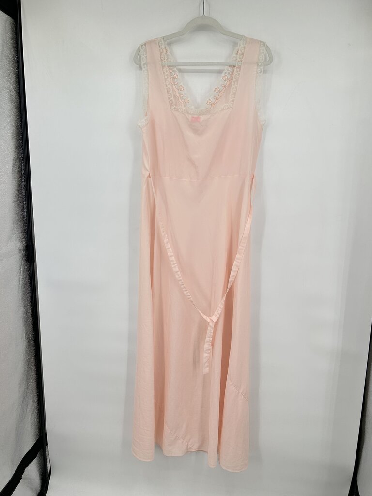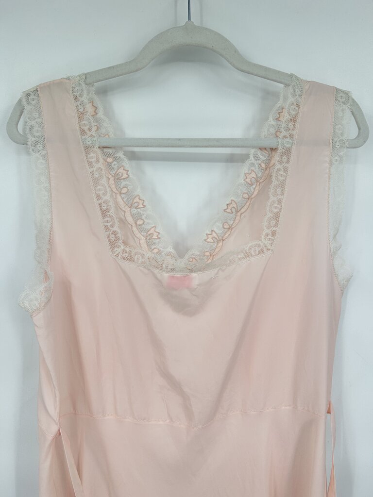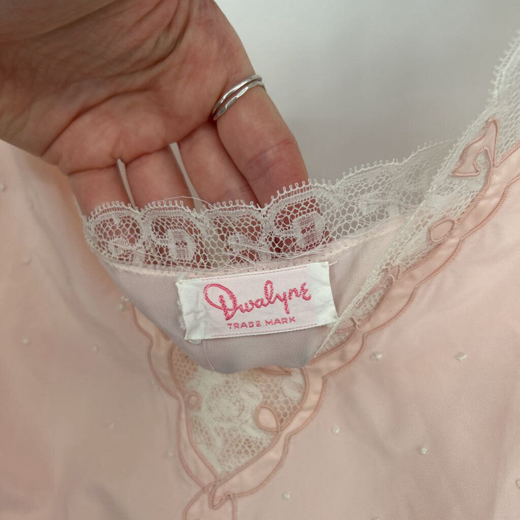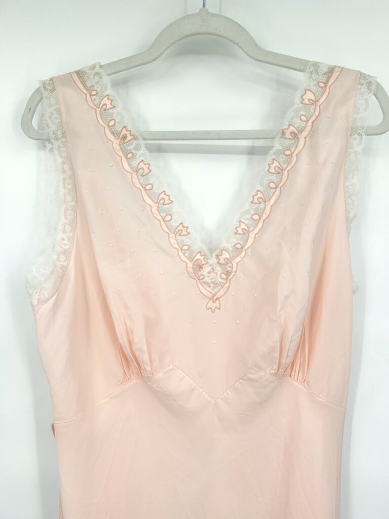 Gorgeous vintage midcentury full slip dress from Divalyn in a pale petal pink. An iconic W-shaped waistline with a gathered bust is topped with embroidered dots, lace trim, and applique details around the V-neckline and square back. Tie back for a custom fit. There are no size or fabric content tags, it feels like acetate and a large based on measurements. Please refer to measurements to confirm fit. 41" bust, 37" waist, and 59" from peak of shoulder.