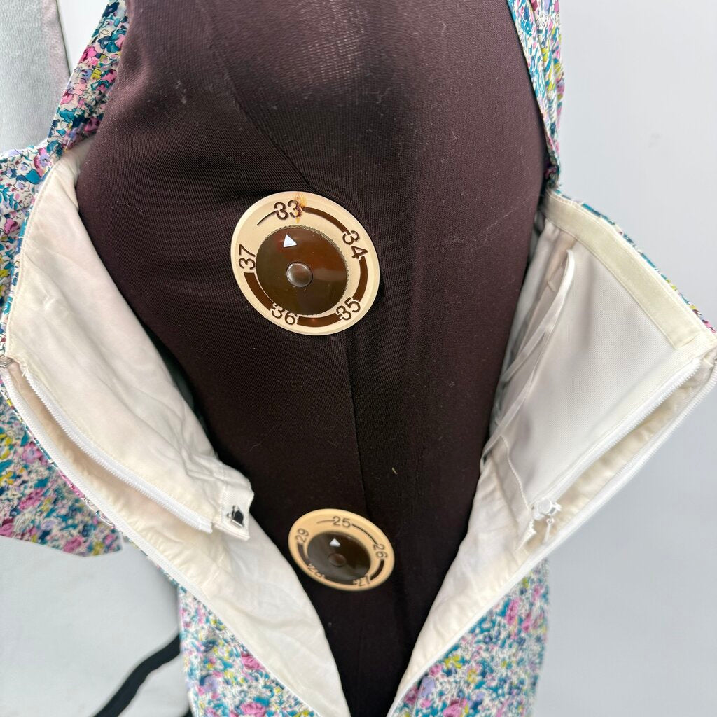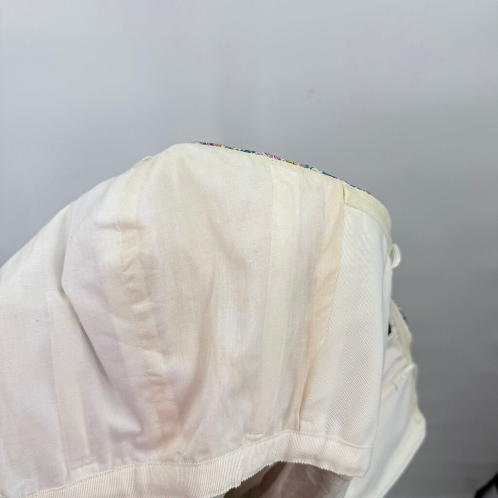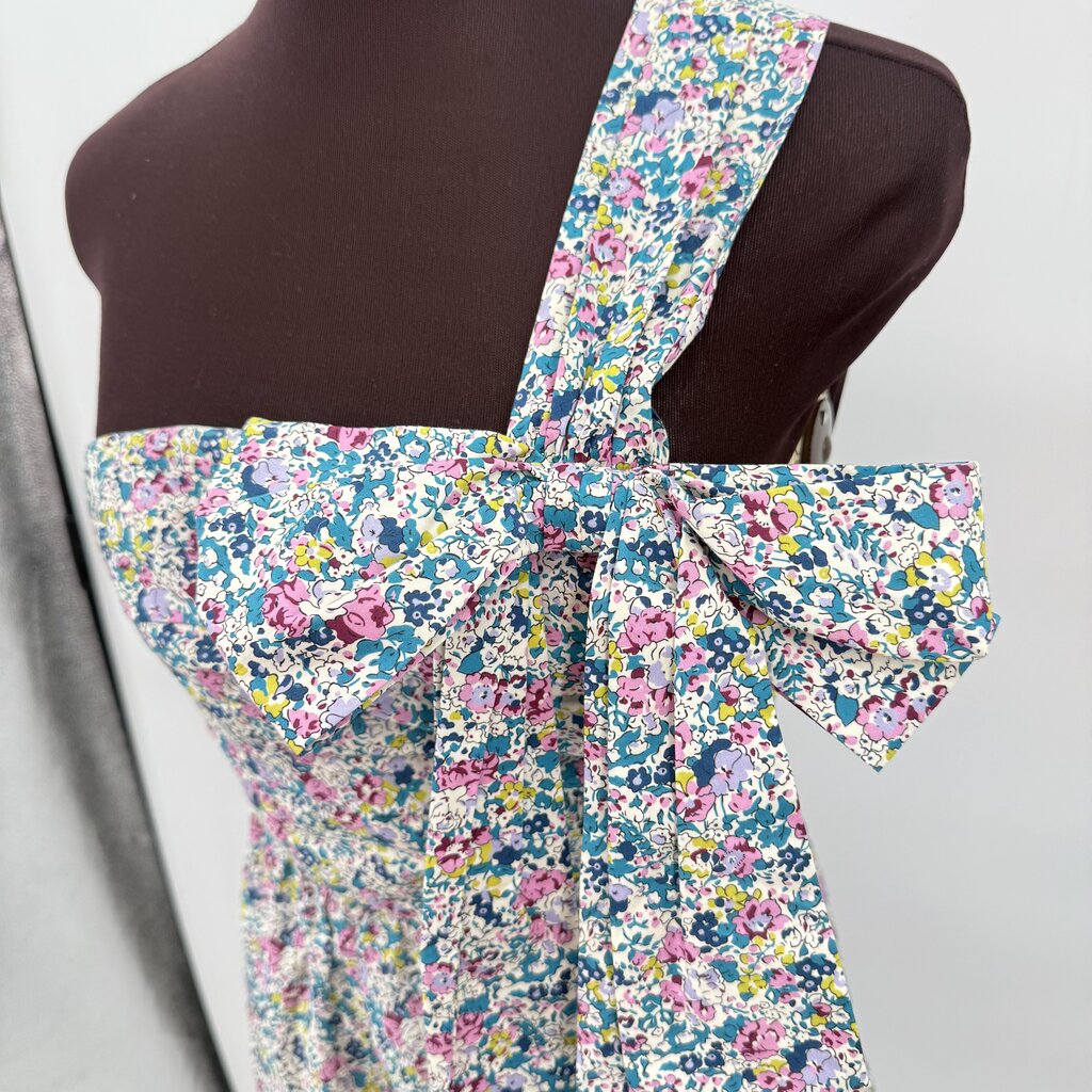Liberty Fabric One Shoulder Cotton Floral Bow Accent Pleated Bust. Pink, lavender, navy blue, teal, and chartruse green flowers on a cream field. Good used condition - exterior is pristine, there is discoloration on the inside of the bodice. 25.5" waist, 30" at top of bust.