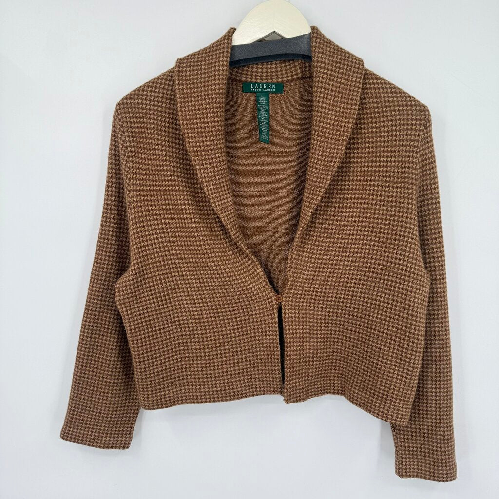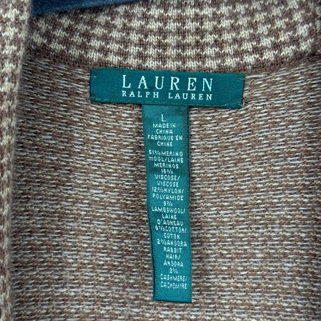 women Lauren Ralph Lauren Merino Blend Houndstooth Cardigan Brown Tan Sweater L