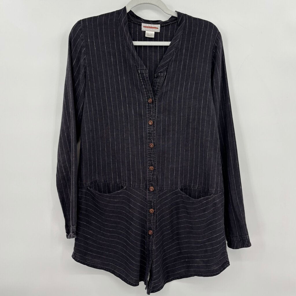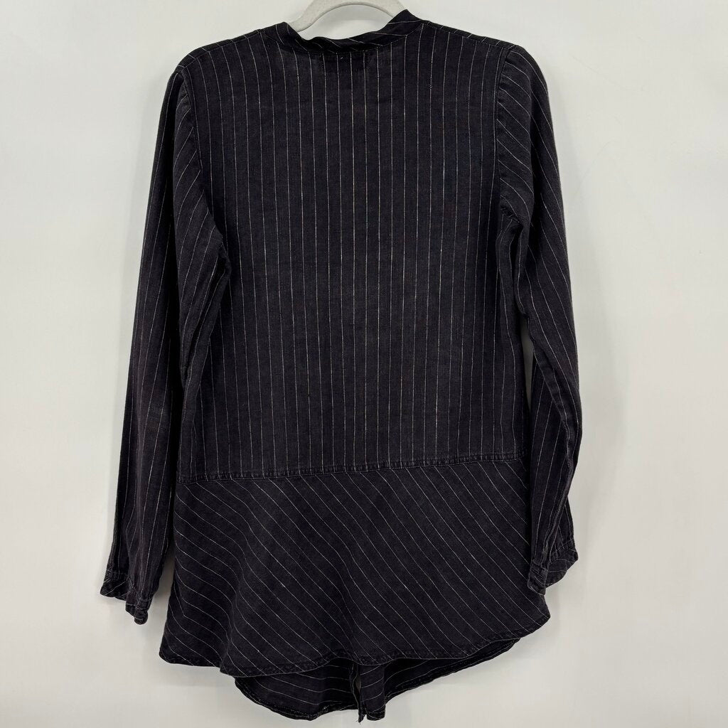 women Solitaire Pencil Stripe Linen Button Front Tunic Gray Woven Top