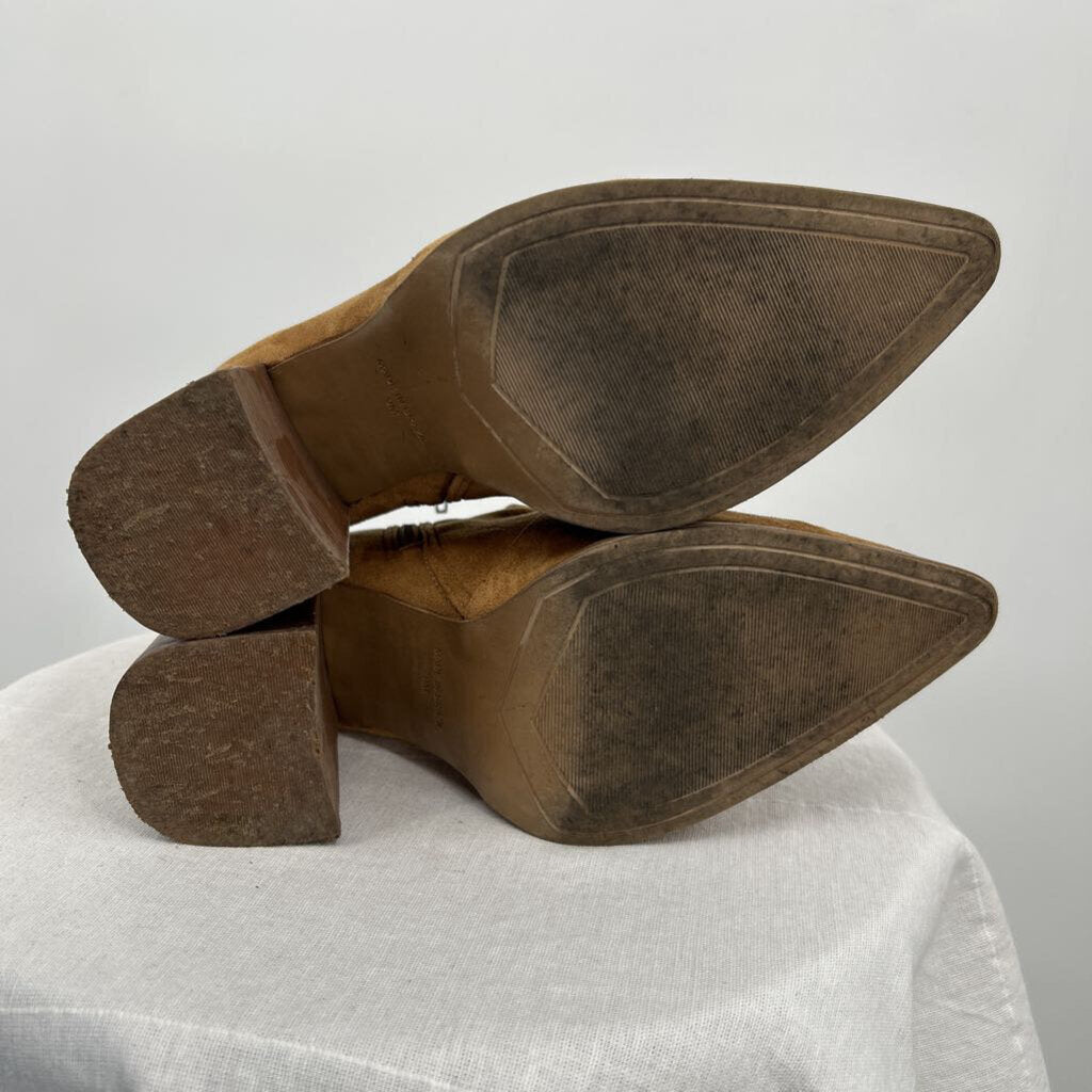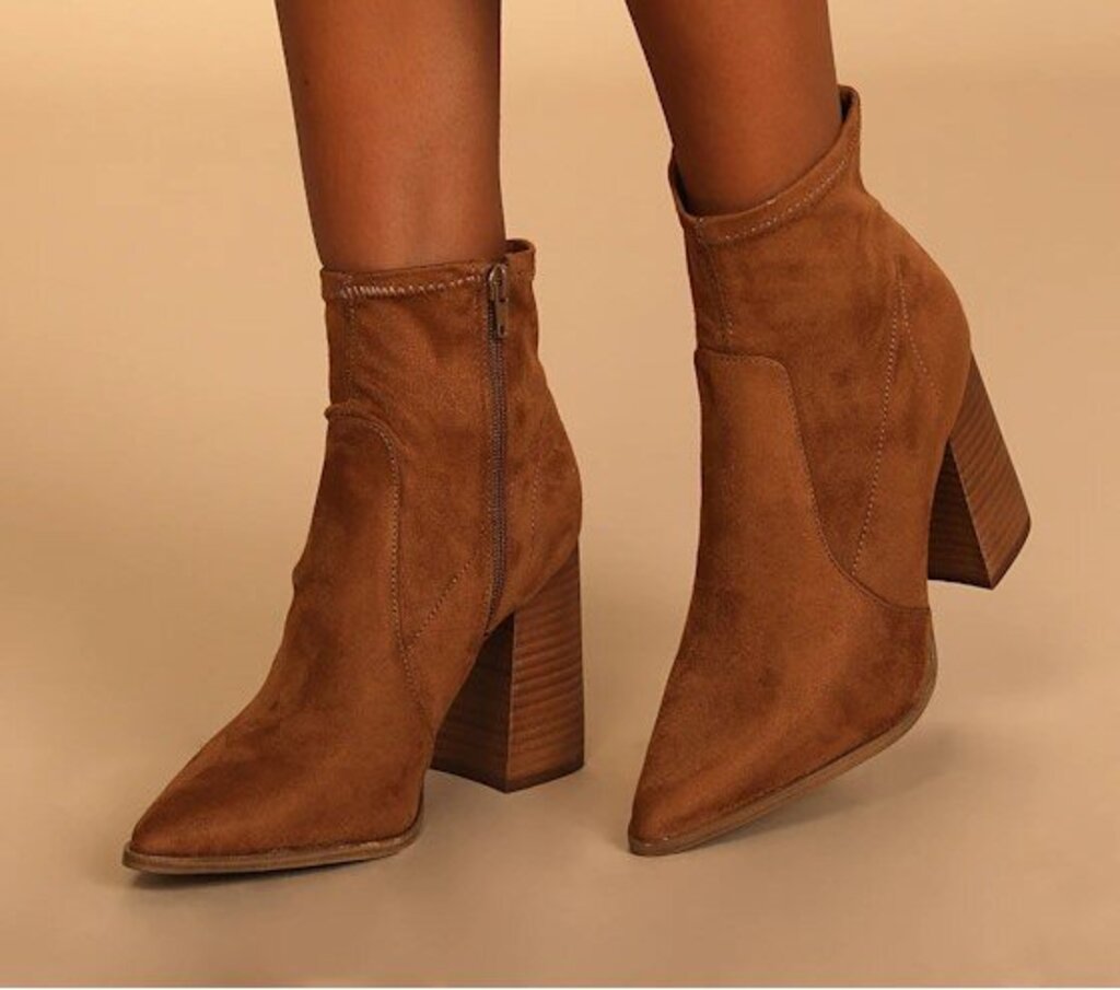 We're all about pairing cozy knits and hot lattes with the Steve Madden Touchdown Chestnut Suede Pointed-Toe Booties! Smooth faux suede shapes these must-have boots with a pointed-toe upper that rises to a seamed ankle-height shaft (with a 5" zipper at the instep), all atop a flared block heel. Man made materials. Imported. 3.5" stacked block heel. Cushioned insole. Rubber sole has nonskid markings.