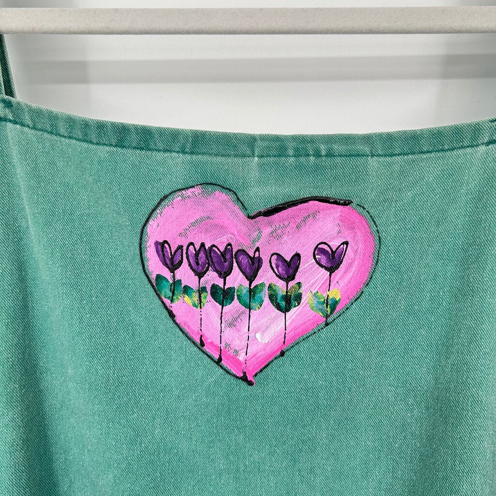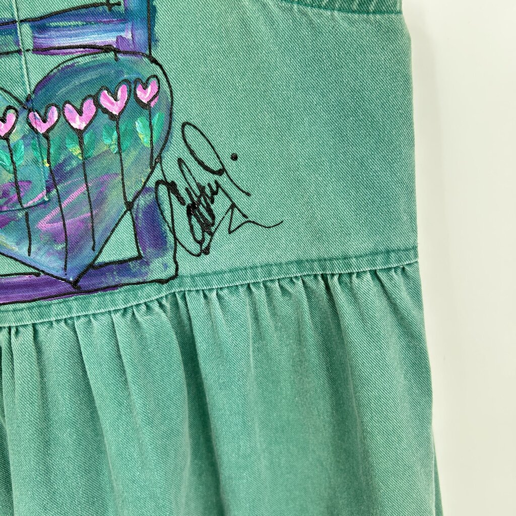One of a kind handpainted cotton twill jumper from the late 80s or 90s signed "Cathy J." Made in USA. Very good condition - wash wear. 43" waist and bust.