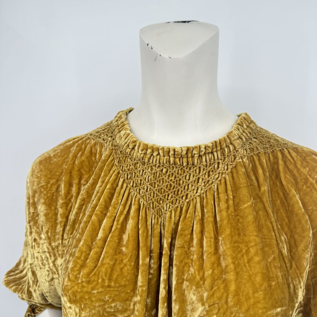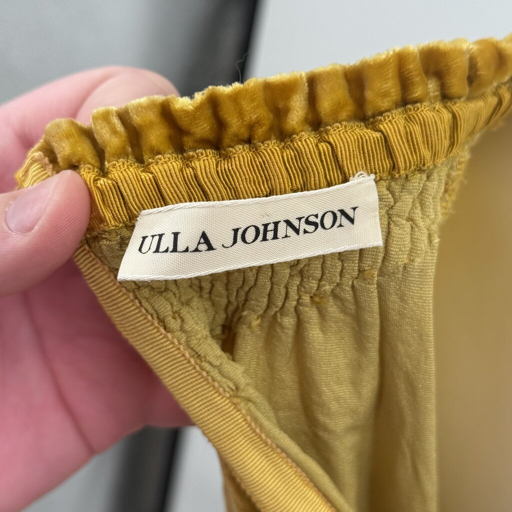 Cut from mustard yellow hand-smocked silk-blend velvet, Ulla Johnson's Sephare jumpsuit is ruched at neck, V-inset, and sleeves. Ruffle-trimmed jewel neck. Ribbon drawstring waist. Three-quarter-length sleeves. Wide legs. 31" inseam. Keyhole button-and-loop closure at nape. Available in Mustard. 82% silk, 18% viscose. Dry clean. Imported. Excellent used condition, but the size and content tags have been removed. Shoulder 16", Sleeve 17", Bust 41", Waist 38", Rise 11", Inseam 31"