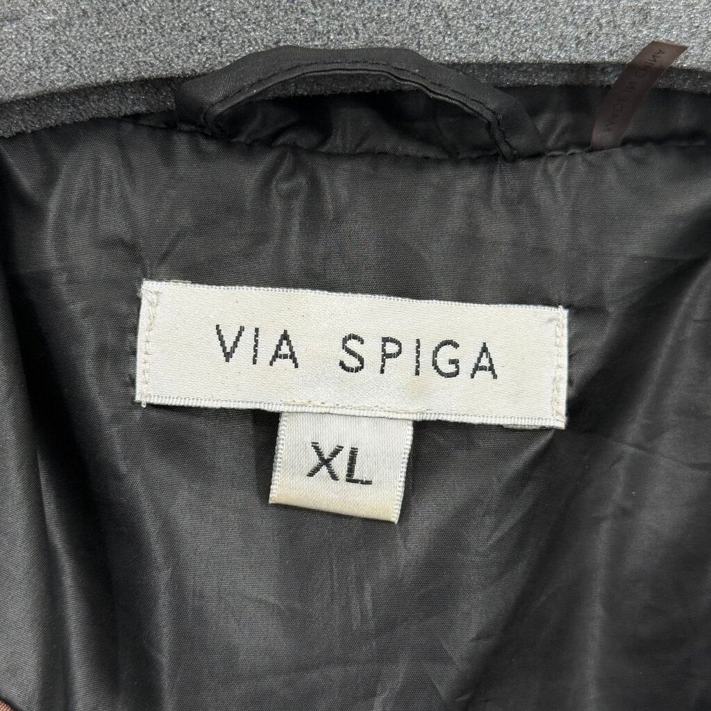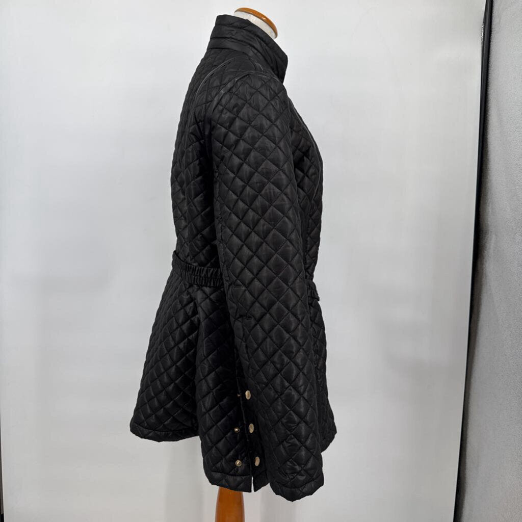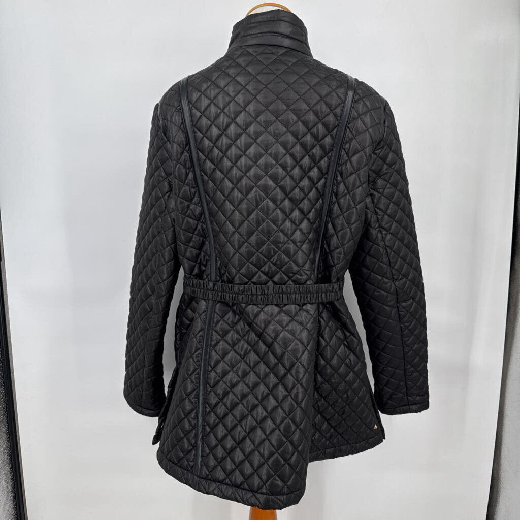 Intricate diamond quilting brings added dimension to this gorgeous belted coat from Via Spiga. Stand collar; front zipper closure. Removable elasticized belt with clip closure; quilted throughout; princess seams. Two welt pockets at front. Lined. Shell, lining & fill: polyester. Machine washable. Excellent used condition. Bust 50", Total Length 32"