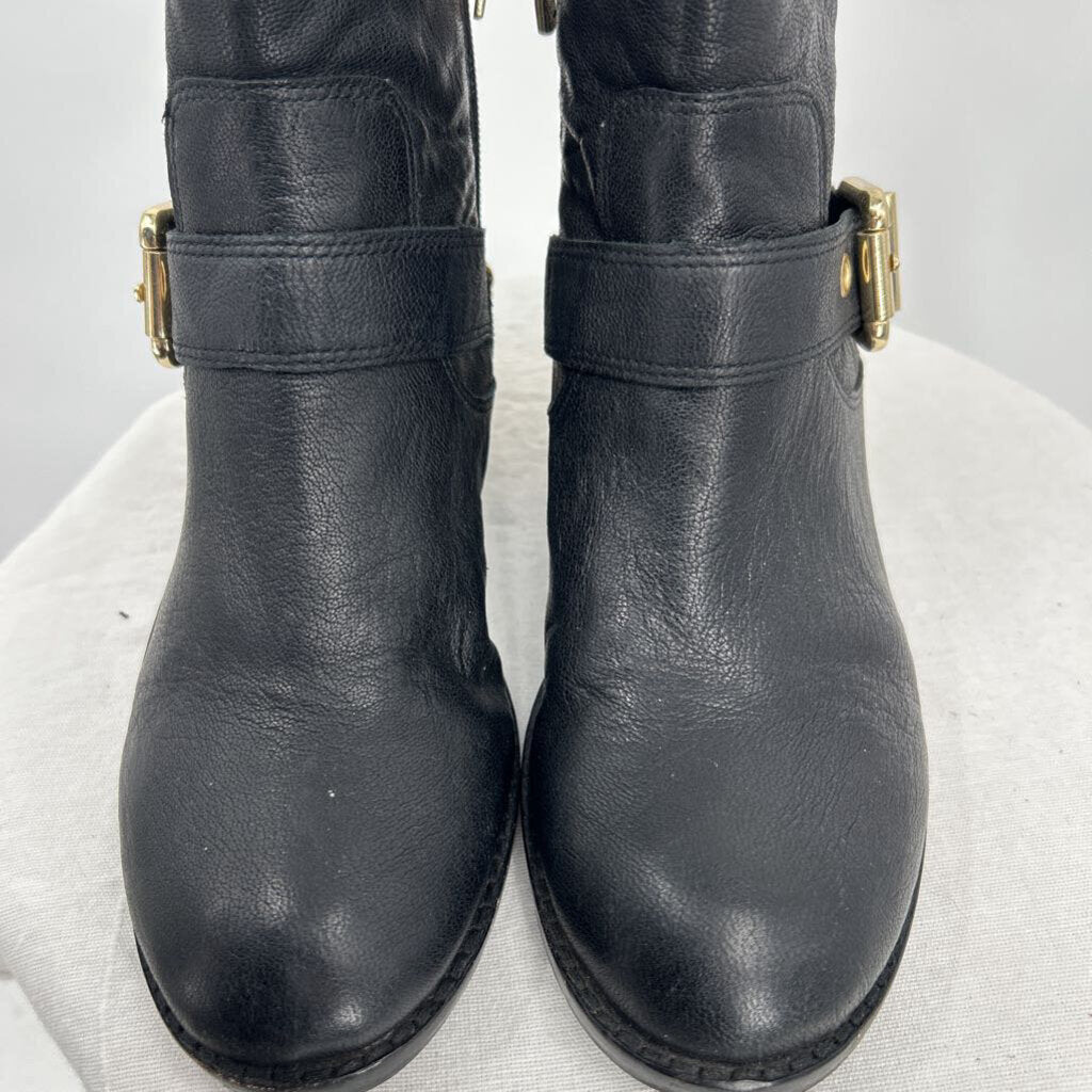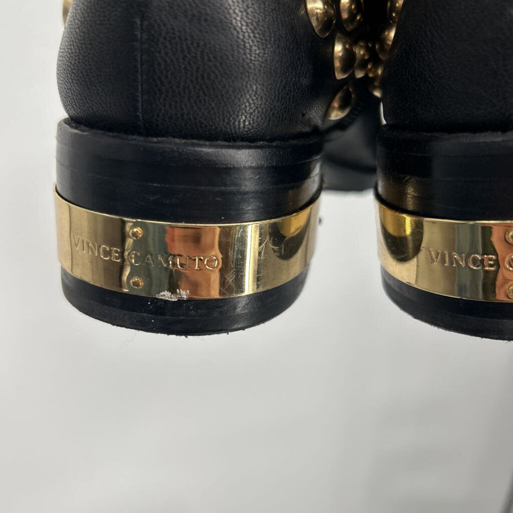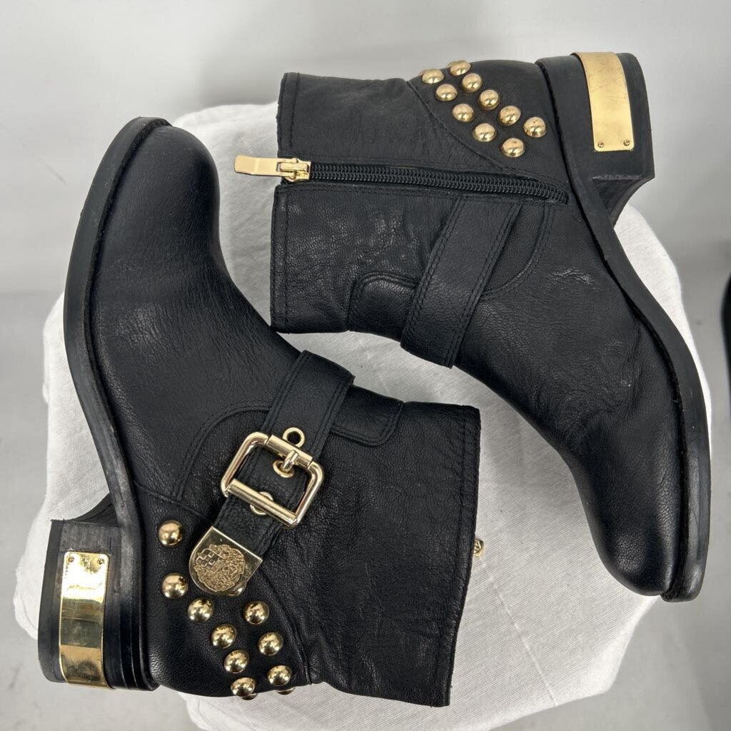 women Vince Camuto Windetta Leather Moto Boots Black Gold Shoes 7.5
